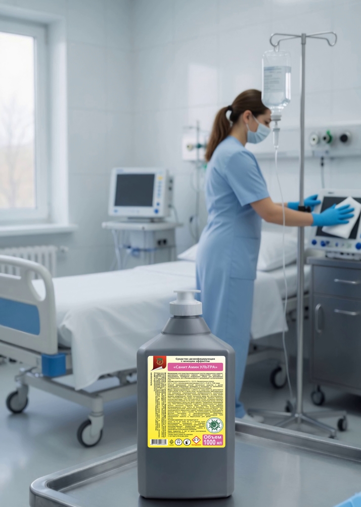 Наша компания разработала новое дезинфицирующее средство с моющим эффектом. В его составе - алкилтриамин (8 - 12%), бензалкония хлорид (0,6 - 0,9%) и ПГМГ (0,24 - 0,40%).