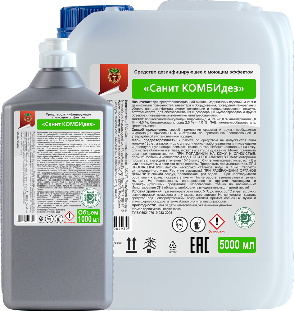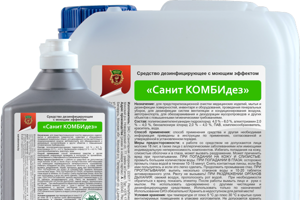 «Санит КОМБИдез» эффективен против бактерий (в т.ч. микобактерий туберкулеза), вирусов и грибов. Также он обладает высокой моющей способностью в воде любой жесткости, не содержит спиртов, хлора, фенола и их производных, не повреждает поверхности.
